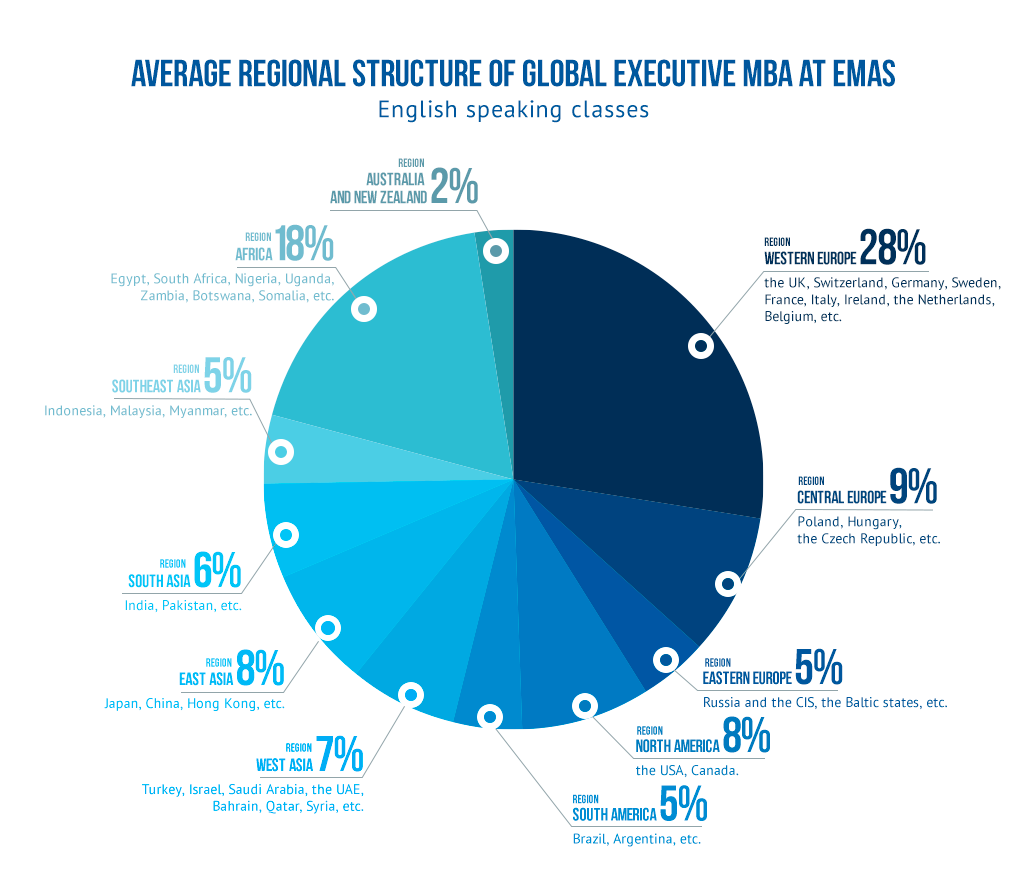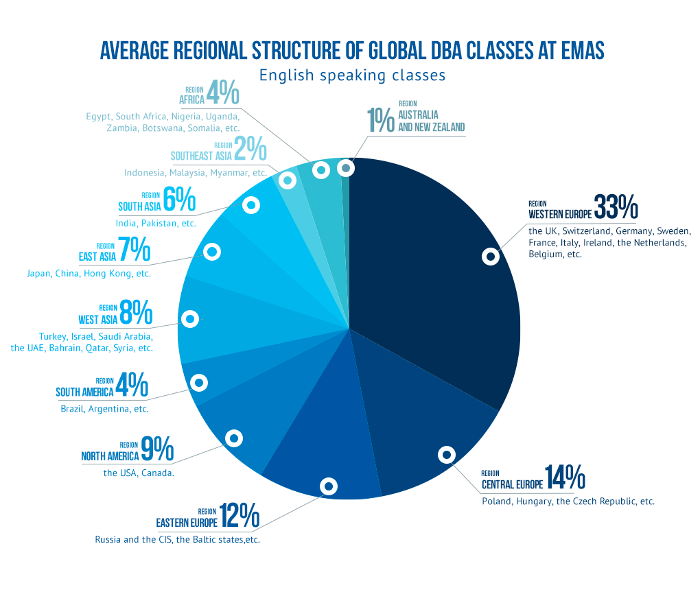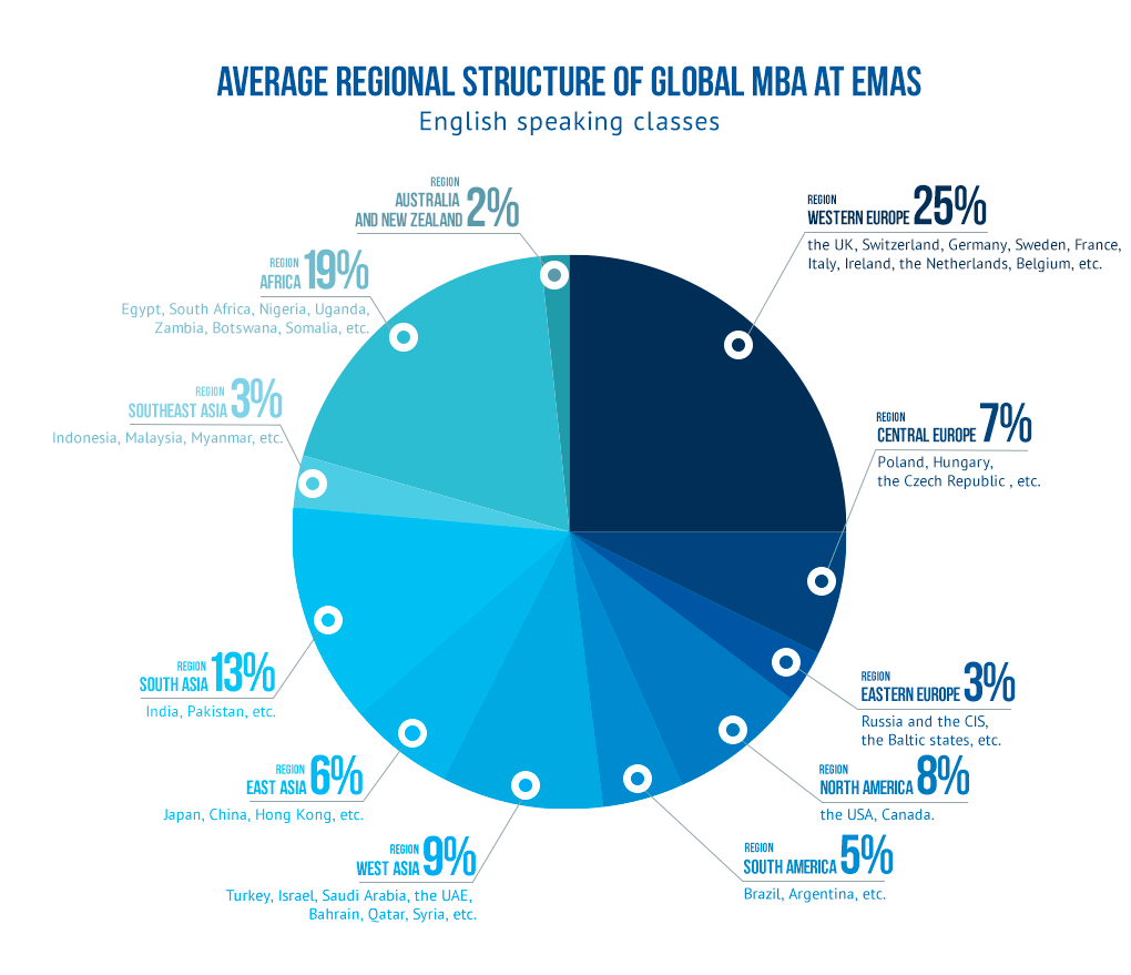 EMAS is one of few global business schools in the world, in comparison with other business schools, which do not have such a large number of students from far-abroad countries and, accordingly, it cannot provide its MBA, Executive MBA and DBA students with such opportunities to gain business connections throughout the world, as EMAS does.